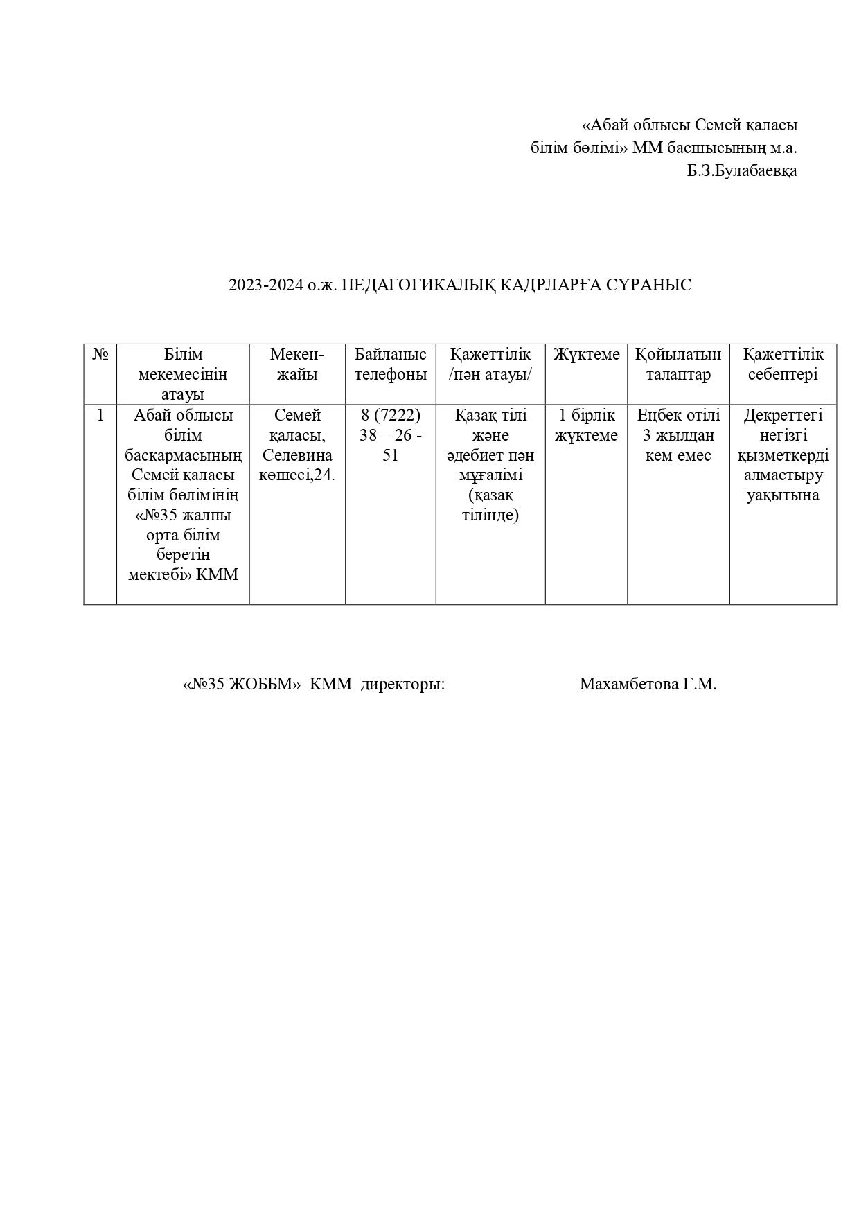 Қазақ тілі және әдебиет мұғалімі декреттегі негізгі қызметкерді алмастыру уақытына конкурс жариялайды » Средняя общеобразовательная школа № 35